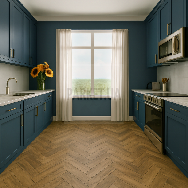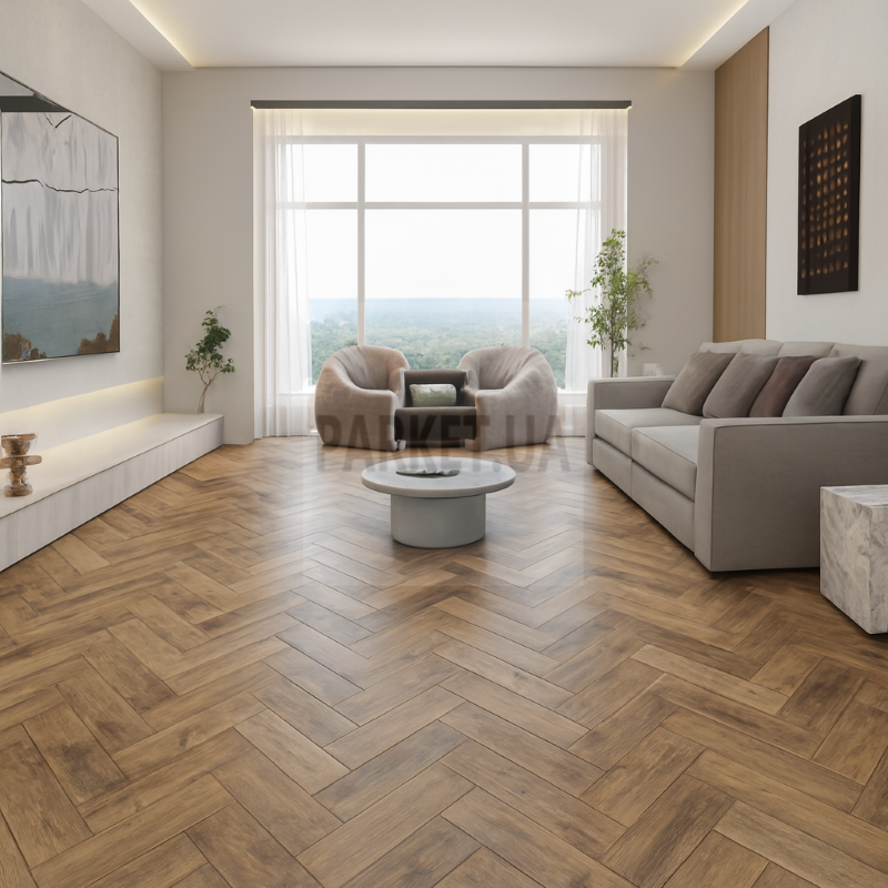 • SPC пол английская ёлка водостойкий — сочетает эстетику паркета с практичностью винила.